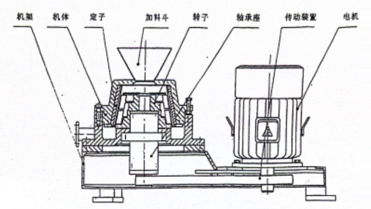 1、采用錐形的轉子與定子,通過升降上箱體(定子)即可調整轉子與定子的間隙來控制產品細度和產量,同除調整范圍為0-5mm;