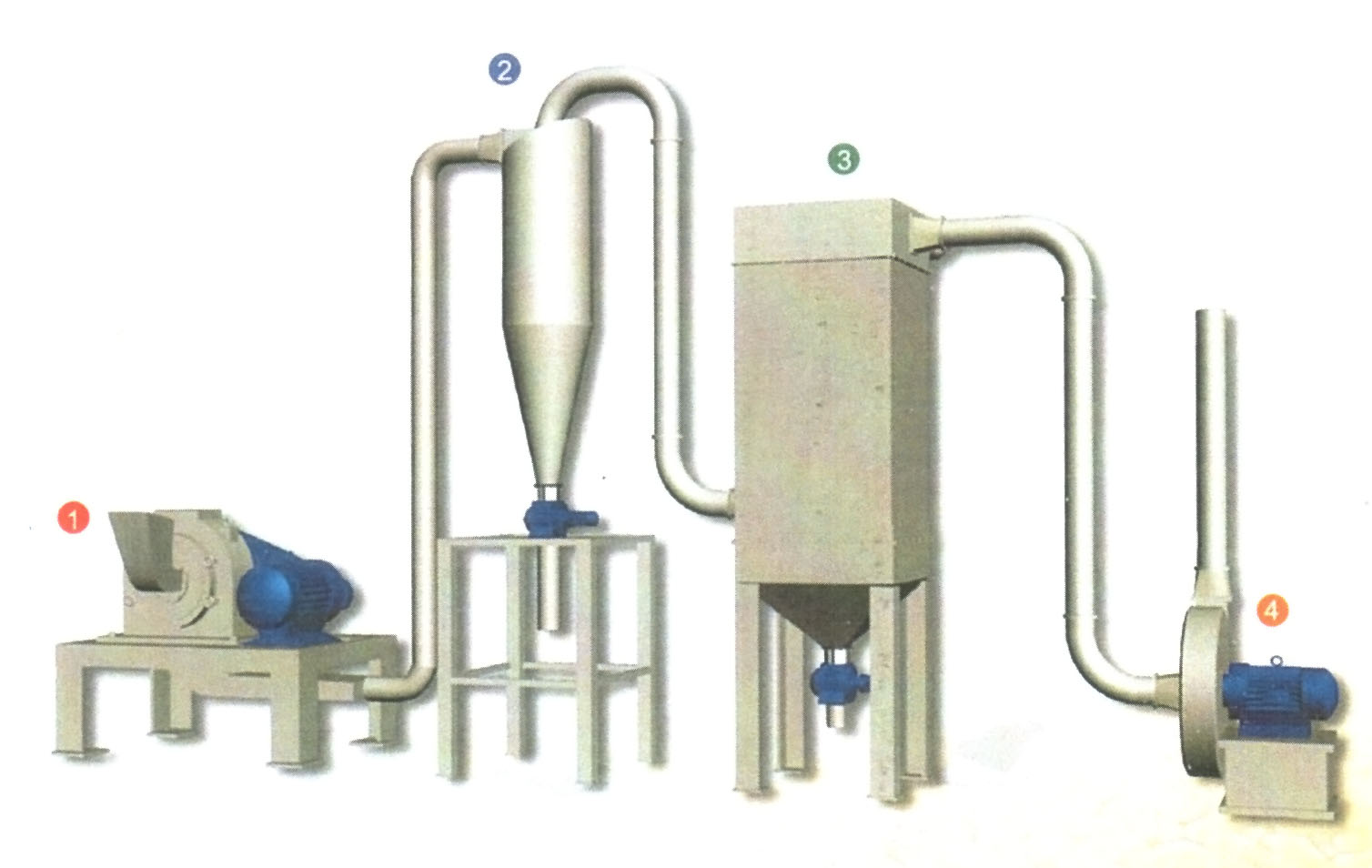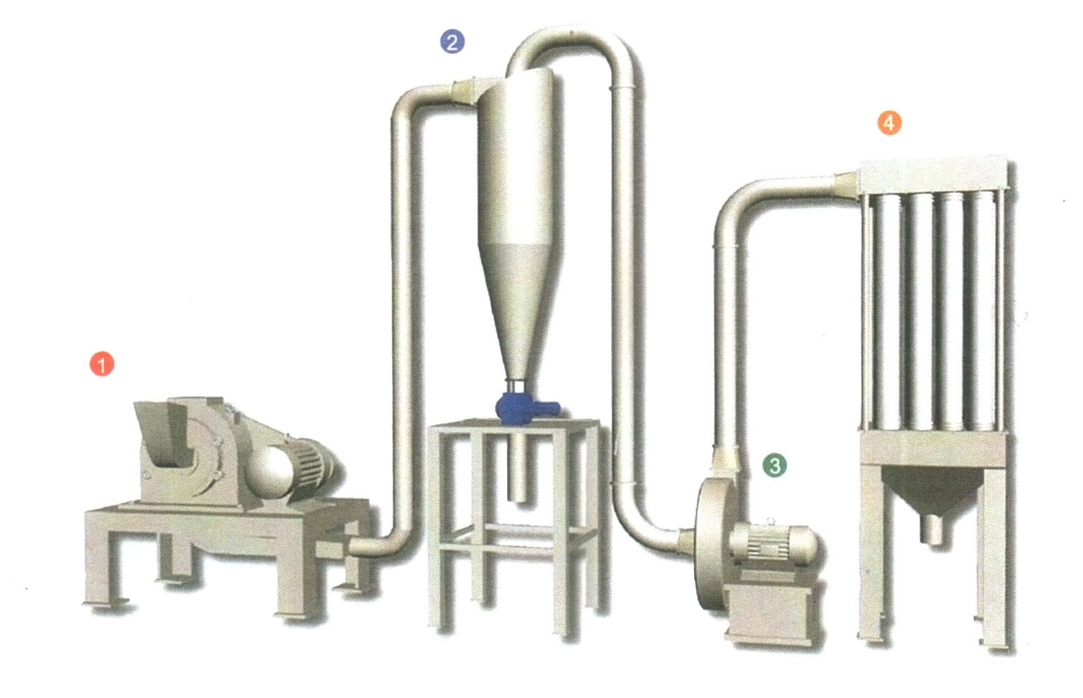 配套由高壓離心風機、關風機、旋風集料器,脈沖除塵器和電控柜等組成整套超微粉碎設備,經出料口排出的物料在離心風機的作用下進入旋風集料器。然后合格產品由旋風集料器下面的關風機來控制卸料。粉塵進入脈沖除塵器收集。