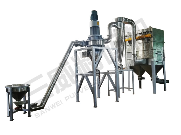 本機(jī)主要利用渦輪分級(jí)的分篩理論:旋轉(zhuǎn)渦輪產(chǎn)生的離心力與空氣所形成的向心力之間的平衡。其主要工作原理是:待分級(jí)的物料通過加料機(jī)被高壓負(fù)壓吸風(fēng)吸入分級(jí)室在這里首先被分散導(dǎo)向葉片分散,在渦殼與分級(jí)渦輪附近受強(qiáng)而有力的離心力場(chǎng)的作用,符合要求的微粉吸出分級(jí)葉輪后被收集裝置收集,粗料則落入下箱體,在這里由于受到二次進(jìn)風(fēng)的影響而被再次分散,夾雜在粗粉中的細(xì)粉再次隨氣流進(jìn)入分級(jí)區(qū),粗料則沿內(nèi)壁下落通過關(guān)風(fēng)機(jī)被收集。由于渦輪與上箱體采用特殊的密封機(jī)構(gòu),使得密封效果十分優(yōu)越,出料粒度更均勻。通過調(diào)節(jié)驅(qū)動(dòng)電機(jī)的轉(zhuǎn)速及二次進(jìn)風(fēng)量的大小,可得到最佳的分級(jí)效果。
